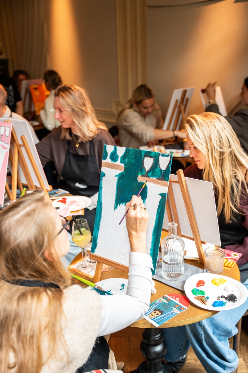 Onder begeleiding van een kunst-instructeur creëren de deelnemers hun eigen meesterwerk, terwijl een host zorgt voor de juiste muziek en goede glazen wijn. Of je nu een natuurtalent bent of voor het eerst een kwast vasthoudt; de focus ligt op ontspanning en het plezier van het maken.
