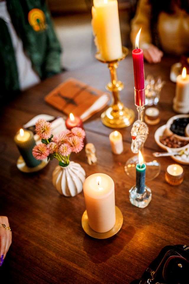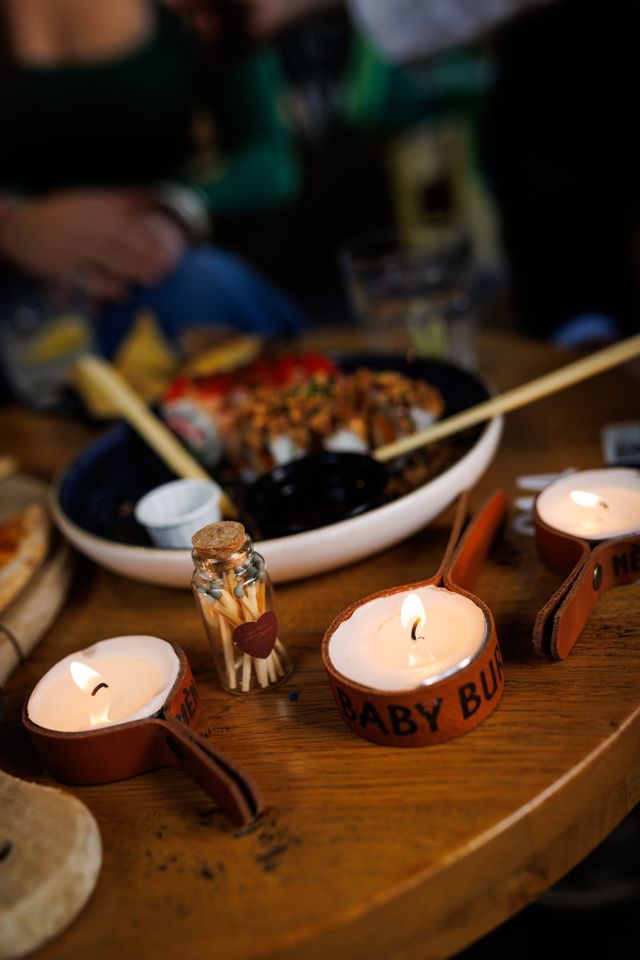 Eefje is volledig gekleed in een vintage outfit van haar eigen winkel Lila Preloved & Vintage, Robin in een outfit van ook zijn eigen winkel Bliek en Kim draagt een outfit van Cotta met sieraden van Tien Tilburg. De sfeervolle tafel is gestyled met spullen van Søstrene Grene, Tien Tilburg, Dille & Kamille, Cool Bananas, De Refter, Snuist en Atelier Leermakers.