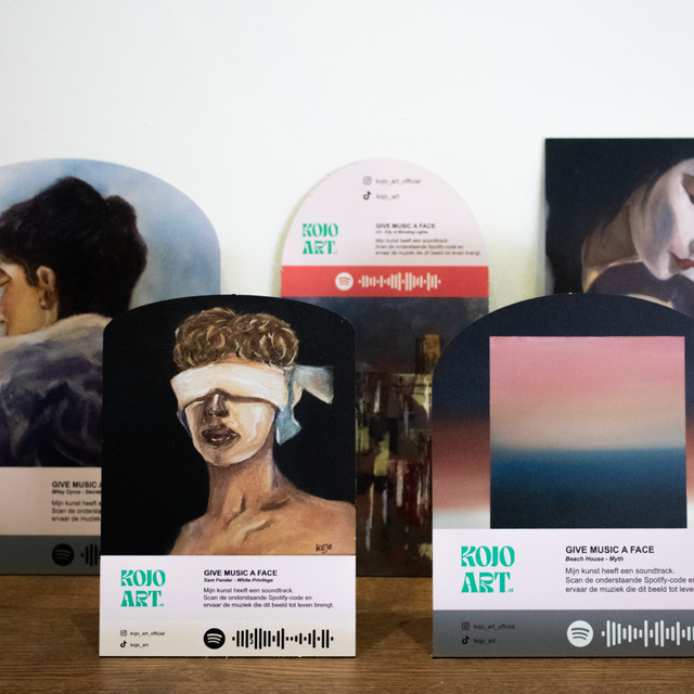 Via de Spotify QR-code op elk werk kun je het bijbehorende nummer beluisteren. Zo ontstaat een spel tussen klank en beeld, tussen wat je ziet en wat je hoort.